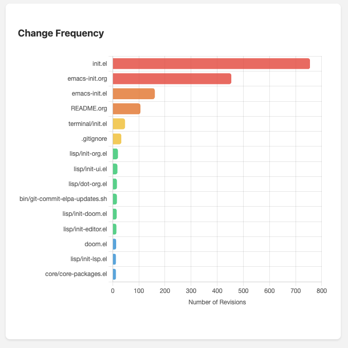 I decided to run this against a personal (what feels like a lifelong or lifetime) endeavor, my emacs config, and was curious to see what the output was. What follows was some insights, however obvious some may be, but also insightful findings from the code-maat output.