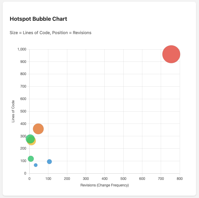 - Top-Right (Red): High complexity + High churn = Refactor now — these are your biggest risks