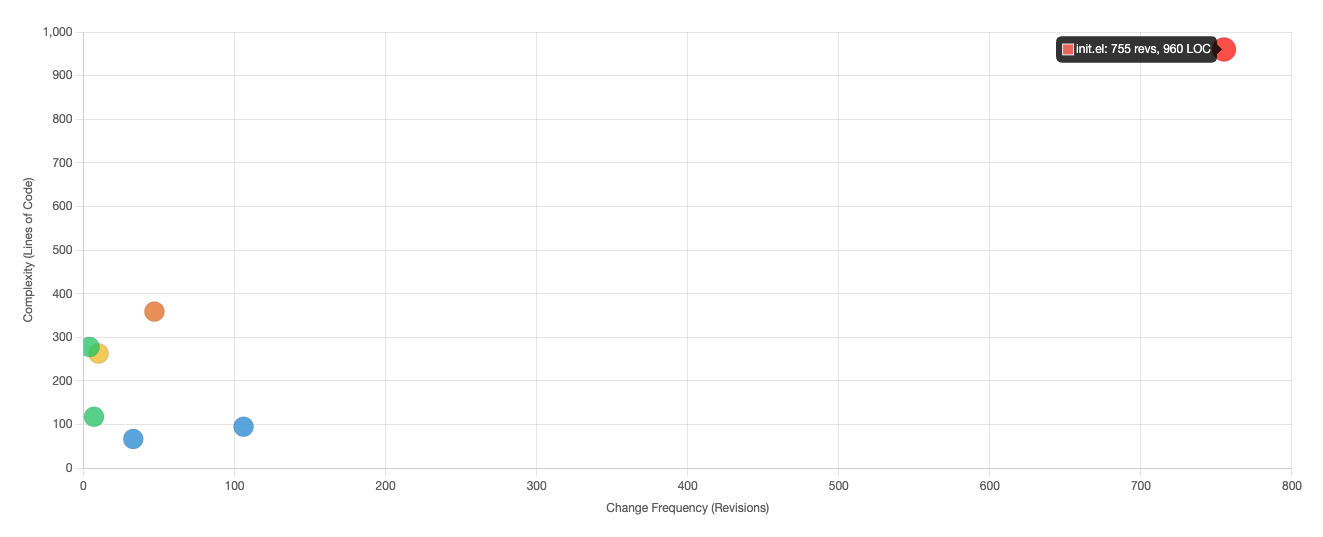 This highlights files with the highest change frequency. These are potential hostpost where bugs tend to cluster and where refactoring may have the highest impact. Since these are screenshots, the large red dot in the first quadrant is my init.el file.