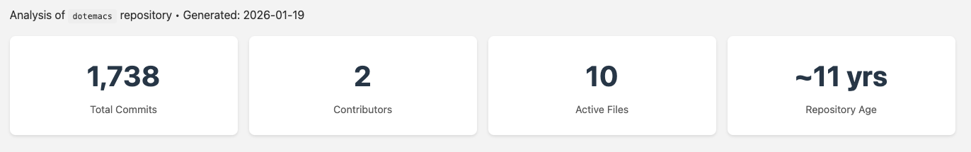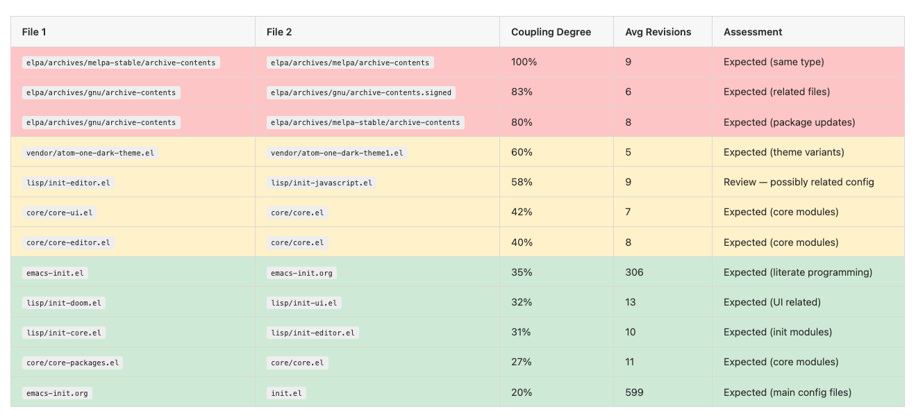 What this shows is files that frequently change together in the same commits. High coupling (60%+) between unrelated files may indicate hidden dependencies. Low coupling between related files (like .el and .org) is expected and healthy. There were no surprises here other than being impressed at how well this worked on first analysis. For example, when my emacs-init.org changed, so did my emacs-init.el in an expected and coupled manner.